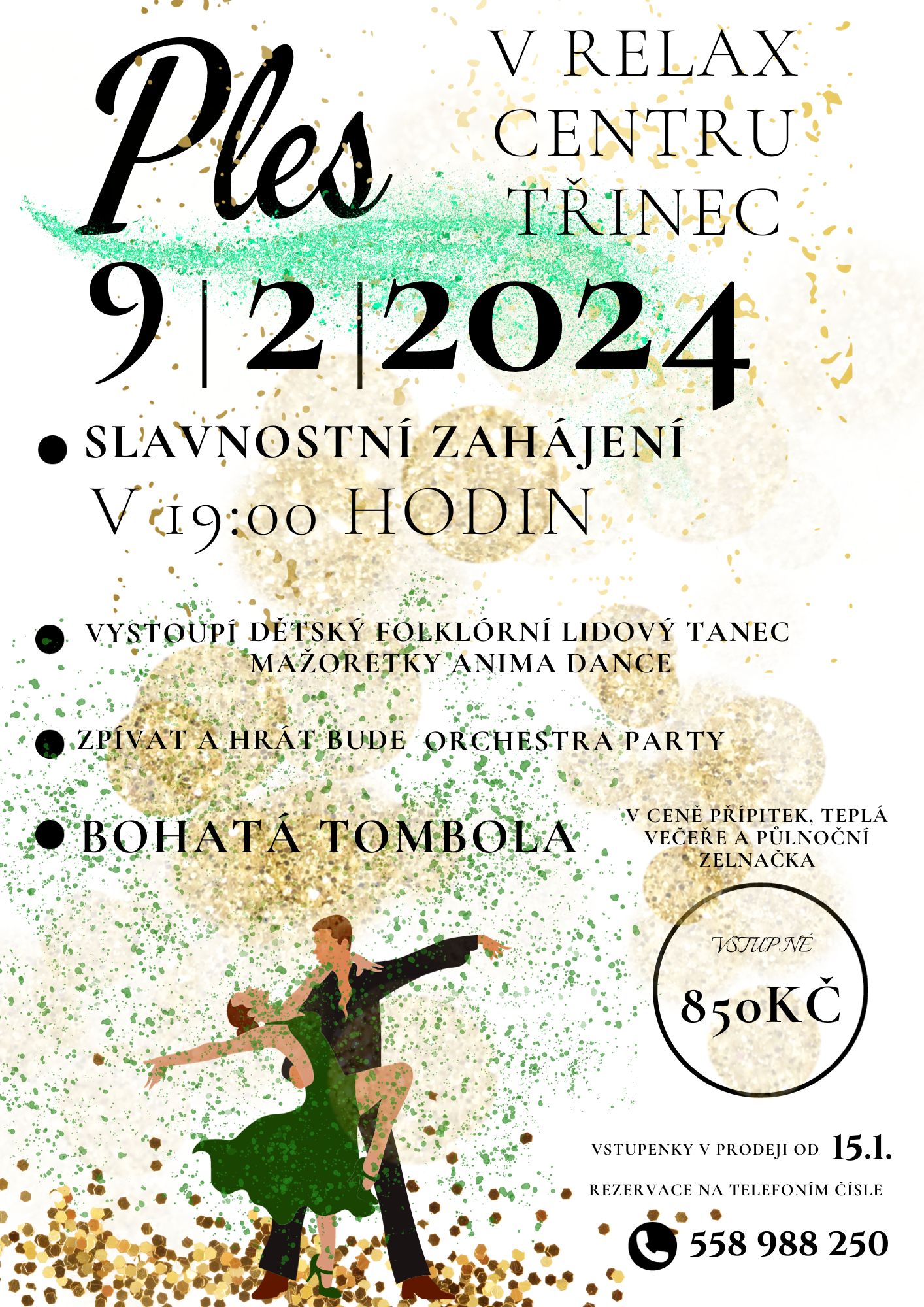 Ples, na kterém nemůžete chybět. Hraje Orchestra párty, mažoretky, vystoupení lidových tanců a tombola. V ceně vstupenky také přípitek, večeře a půlnoční zelňačka. Končíme, až půjdete domů. Pospěšte si s rezervacemi, počet míst je omezen na 70.